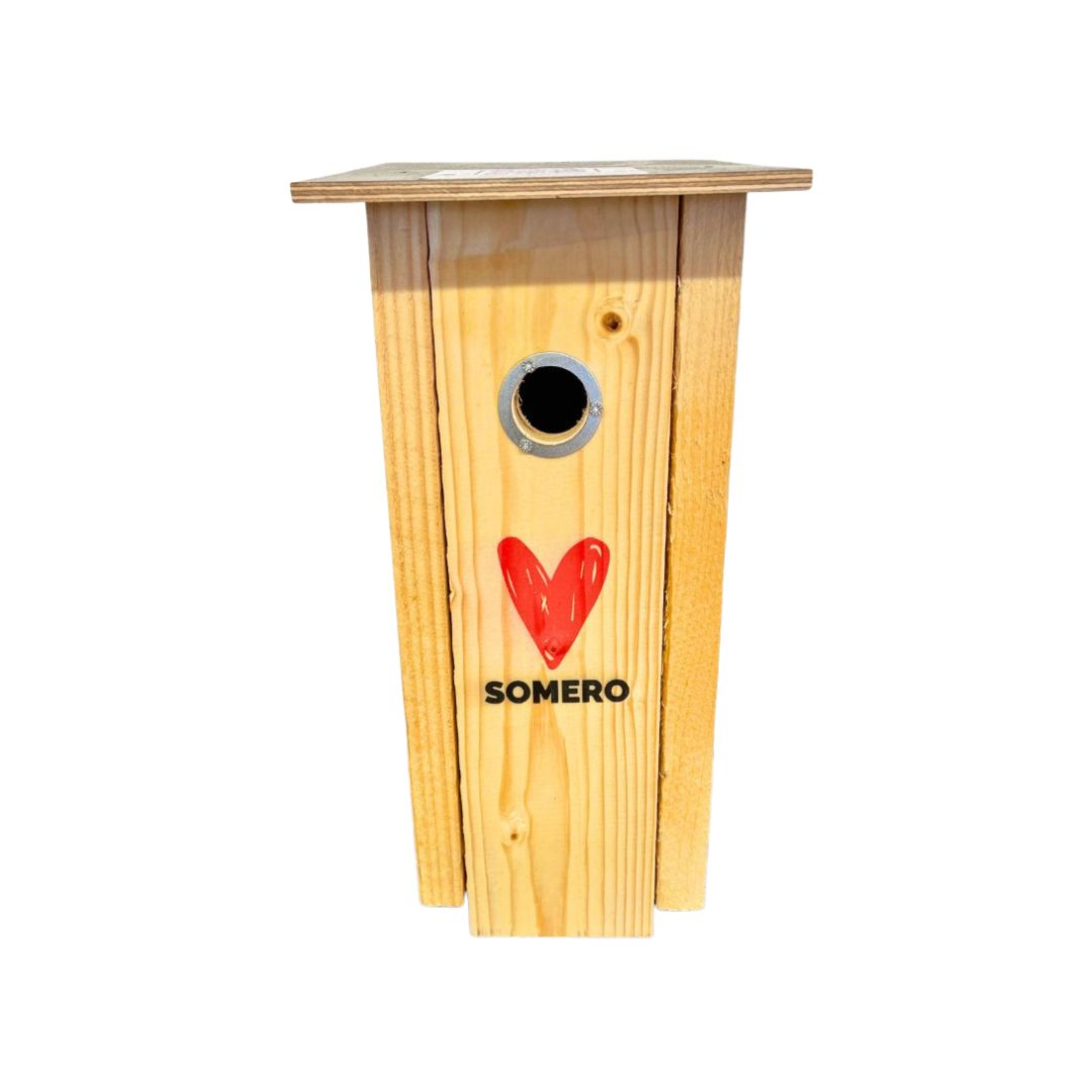 Puunvärisessä linnunpöntössä sydän ja teksti SOMERO. Mustassa linnunpöntössä vaakuna ja teksti KOTI SOMEROLLA.